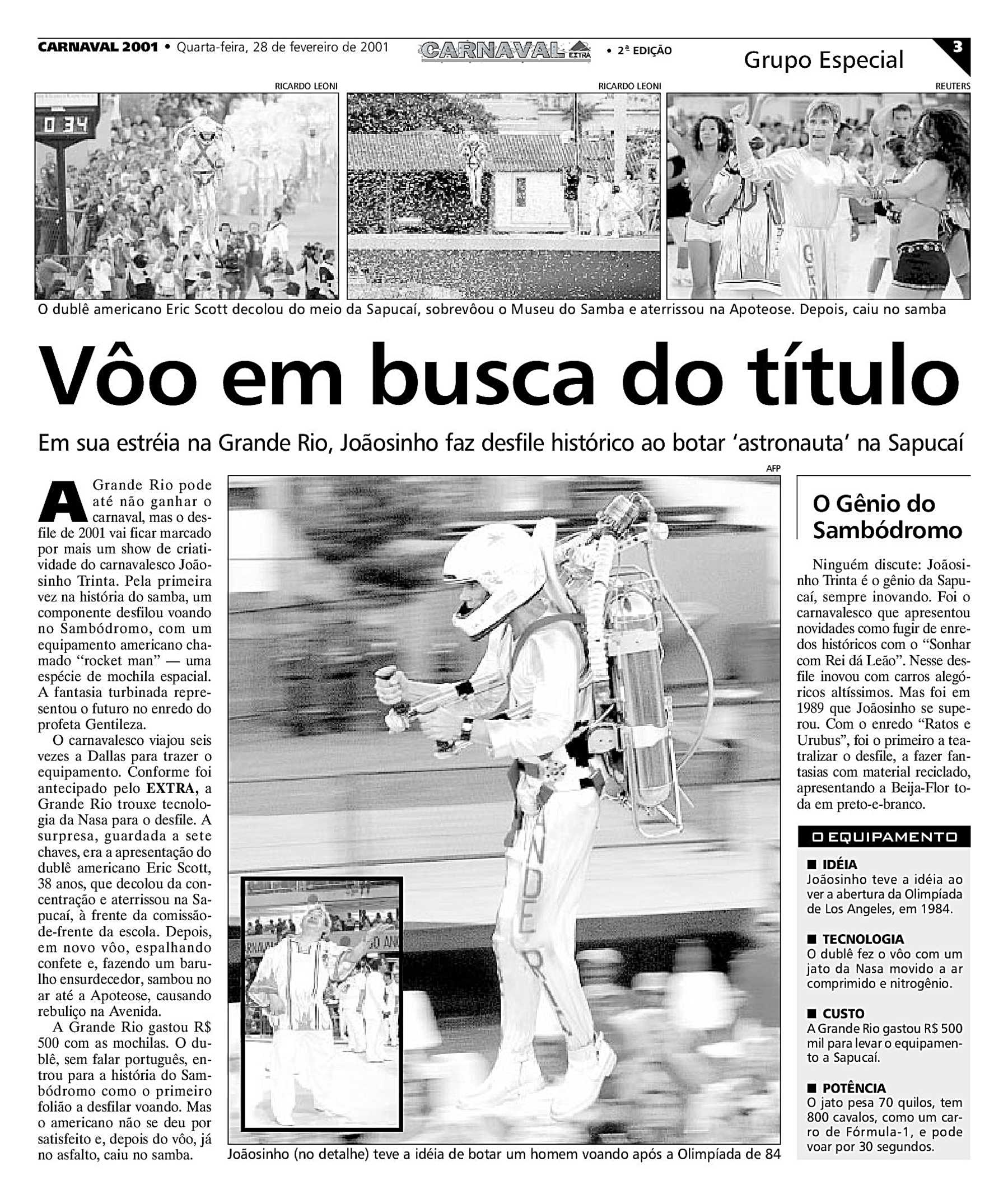 A Grande Rio promoveu mudanças em sua equipe para o carnaval de 2001. Quinho assumiu o posto de intérprete oficial, substituindo Nêgo, que se desligou da escola após sete anos. A Comissão de Frente passou para o comando de Bira Xavier. Sidclei Santos assumiu o posto de primeiro mestre-sala, formando par com Verônica. Rainha de bateria da escola em 1996, a atriz Mônica Carvalho reassumiu o posto. A Grande Rio também trocou de carnavalesco, contratando o multicampeão Joãosinho Trinta, que desenvolveu um enredo sobre o Profeta Gentileza, um ex-empresário de Niterói, que, impressionado com o incêndio do Gran Circus Norte-Americano, que matou 503 pessoas em 1961, passou a pregar a gentileza pelas ruas do Rio de Janeiro, ganhando notoriedade por fazer inscrições em pilastras do Viaduto do Gasômetro.[72] A Grande Rio foi a última das sete agremiações que se apresentaram na segunda noite (segunda-feira) do Grupo Especial. O desfile ficou marcado pela participação do dublê de astronauta, treinado pela Nasa, Eric Scott, que realizou três voos no Sambódromo com um propulsor a jato. Autor da ideia, inspirado na abertura das Olimpíadas de 1984, Joãosinho Trinta viajou seis vezes aos Estados Unidos para contratar a atração, que custou 143 mil dólares, cerca de 12% do orçamento da Grande Rio para 2001.[73] O voo do americano é comumente listado entre os mais marcantes da história do carnaval.[74][75][76] Especialistas classificaram o desfile como "histórico", listando a escola entre as favoritas ao título do ano.[77][78][79] A Grande Rio finalizou sua apresentação recebendo gritos de "campeã" do público no Sambódromo e também foi eleita a melhor escola do ano em pesquisa realizada pelo IBOPE com o público presente na Sapucaí.[80] Apesar dos elogios, Grande Rio se classificou em sétimo lugar, ficando de fora do Desfile das Campeãs. A escola conseguiu a pontuação máxima nos quesitos Bateria, Comissão de Frente, Enredo e Fantasias. O quesito mais despontuado foi Alegorias, com a perda de três pontos.[81] A escola ainda teve um problema com a alegoria "O Circo de Roma Pagã", que desacoplou, fazendo a agremiação ultrapassar o limite máximo de oito alegorias permitidas pelo regulamento, resultando numa penalização de três pontos.[82] Após o carnaval, o dublê americano fez uma exibição especial para a comunidade da escola, reunindo cerca de quinze mil pessoas em Duque de Caxias.[83]
