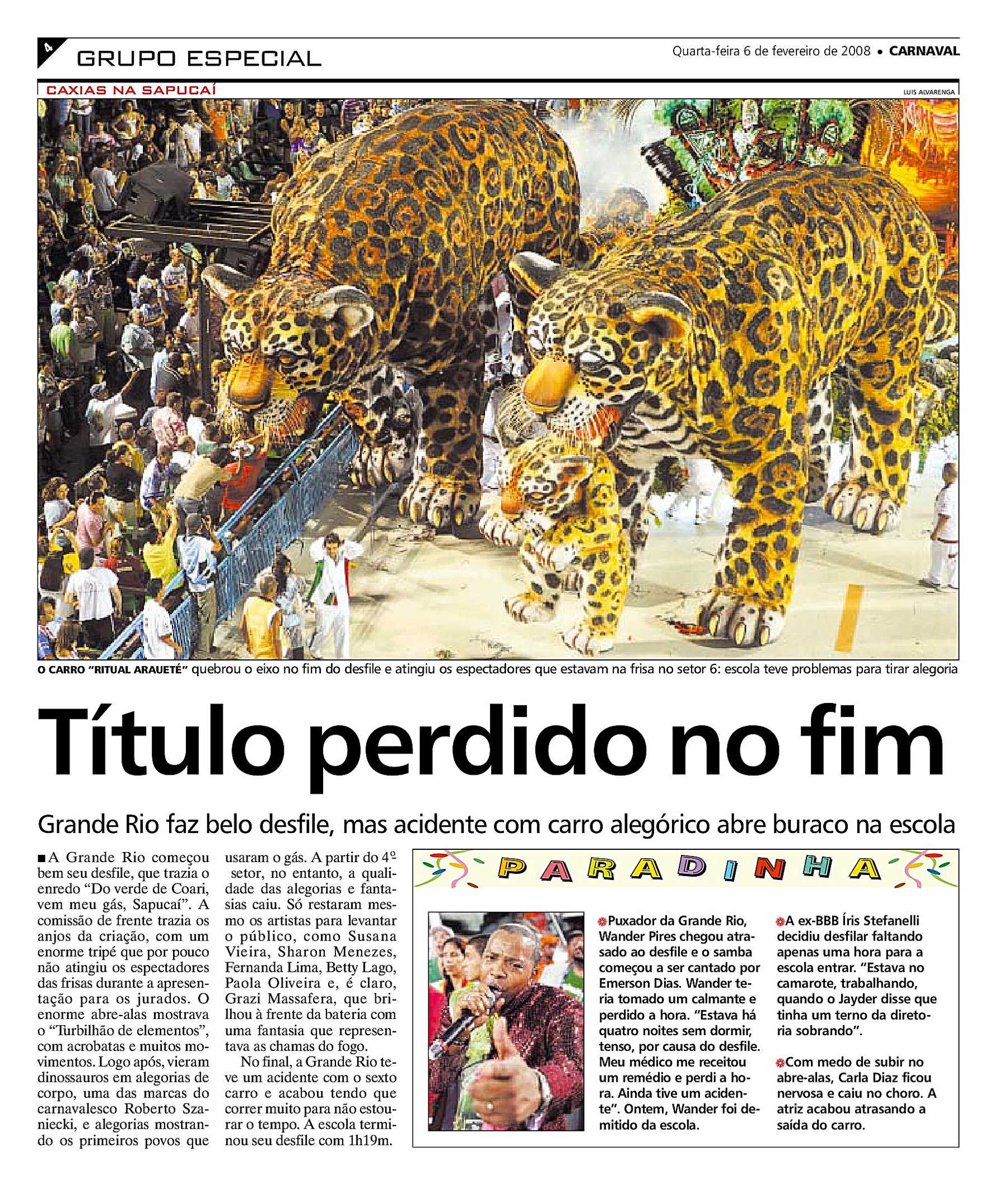Quinta escola a se apresentar na segunda noite (segunda-feira) do Grupo Especial do carnaval de 2008, a Grande Rio realizou um desfile sobre o gás natural com patrocínio do município amazonense de Coari, conhecido como a "terra do gás".[124][125] Especialistas destacaram a beleza das fantasias e alegorias criadas pelo carnavalesco Roberto Szaniecki, mas apontaram uma série de problemas que tirariam a escola da disputa pelo título. O intérprete Wander Pires chegou atrasado e o samba-enredo começou sendo puxado pelo cantor de apoio, Emerson Dias. Wander alegou que tomou um calmante, "perdeu a hora", e ainda sofreu um acidente à caminho do Sambódromo. Após o desfile, o intérprete foi demitido pela escola. O eixo de direção da sexta alegoria quebrou quando ela chegava ao final da pista, atingindo os espectadores que estavam na frisa do setor seis. O carro foi empurrado com muita dificuldade, atrasando a evolução da escola e abrindo um "buraco" (espaço vazio) entre a ala da frente. Ao final, componentes precisaram correr para não ultrapassar o tempo limite de desfile. A Grande Rio finalizou sua apresentação faltando um minuto para ultrapassar o tempo limite. A escola ainda perdeu um décimo por exceder o limite de oito alegorias permitidas pelo regulamento após um de seus carros, com dois chassis, se desacoplar durante o desfile.[126][127] Apesar dos problemas, a Grande Rio se classificou em terceiro lugar. A escola conseguiu a pontuação máxima nos quesitos Bateria e Comissão de Frente. Os quesitos mais despontuados foram Enredo e Conjunto, com a perda de meio ponto em cada.[128] A Bateria de Mestre Odilon recebeu os prêmios Tamborim de Ouro e Troféu Rádio Manchete.[129][130]