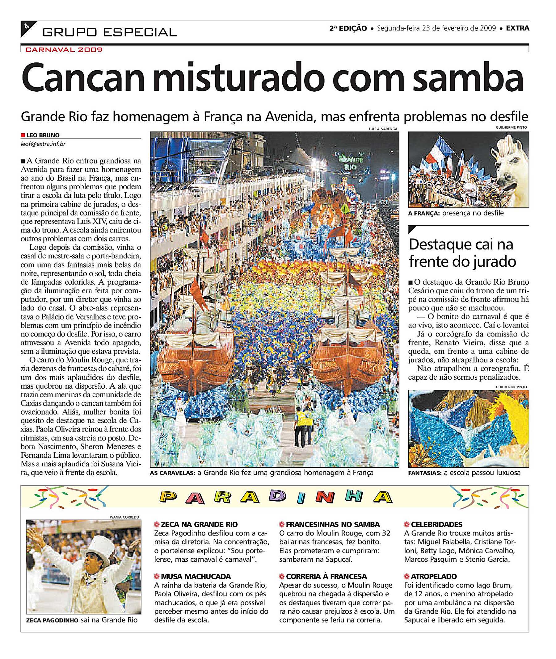 No ano da França no Brasil (2009), a Grande Rio realizou um desfile sobre a relação entre os dois países. A escola contratou o carnavalesco Cahê Rodrigues e o intérprete Wantuir. A atriz Paolla Oliveira foi coroada Rainha de Bateria. A Grande Rio foi a segunda escola a se apresentar na primeira noite (domingo) do Grupo Especial do carnaval de 2009.[131] Com o patrocínio de vinte empresas francesas, a escola realizou um desfile luxuoso, com alegorias grandes e fantasias volumosas.[132] A fantasia de Sidclei e Squel foi decorada com nove mil micro lâmpadas controladas por um técnico numa mesa de luz. Outro destaque da apresentação foi a alegoria referente ao cabaré parisiense Moulin Rouge, que teve a participação de 32 dançarinas de cancã vindas da França. Segundo especialistas, a escola conseguiu animar o público presente na Sapucaí, mas teve problemas que poderiam custar o título.[133][134] Um componente da Comissão de Frente, que representava o Rei Luís XIV, caiu de cima de um tripé enquanto se apresentava aos jurados. Dois carros, incluindo o abre-alas, tiveram problema de iluminação, passando apagados a maior parte do desfile.[135][136] A Grande Rio recebeu os prêmios Tamborim de Ouro de melhor samba-enredo, melhor casal de mestre-sala e porta-bandeira (Sidclei e Squel) e melhor intérprete (Wantuir).[137] Perdendo décimos em todos os quesitos, a escola se classificou na quinta colocação. O quesito mais despontuado foi Alegorias, com a perda de oito décimos. Os quesitos mais bem avaliados foram Bateria, Conjunto e Evolução, com a perda de um décimo em cada.[138] Após o desfile, o mestre de bateria, Odilon, anunciou seu desligamento da escola alegando problemas com a diretoria da agremiação.[139]